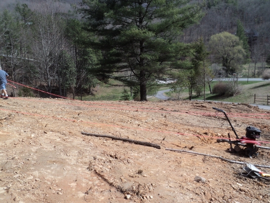 Signs of Spring have finally arrived to the N GA mountains. Saturday was a beautiful day to be out working. The sun was shining bright with temps in the mid 60’s. I was forced to change the locations of the rows after discovering areas of hard pan. Hard pan is soil compacted to a very rock-like hardness that water will not penetrate and roots cannot breach. My hope is that since the vines are 6 ft apart, careful planning will allow the vines to straddle the narrow ribbons of hard pan. Grape roots go very deep, but not so wide. Any hard pan I encounter when planting will be aggressively attacked to create areas for roots.