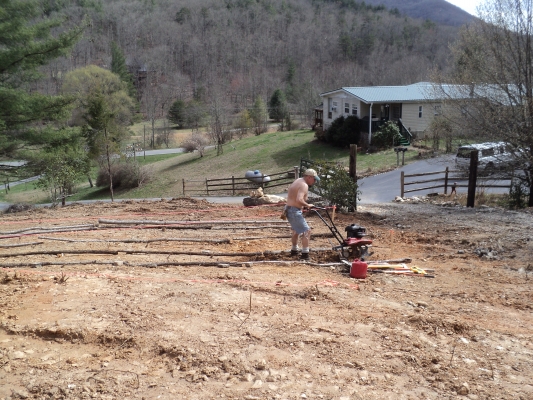 Signs of Spring have finally arrived to the N GA mountains. Saturday was a beautiful day to be out working. The sun was shining bright with temps in the mid 60’s. I was forced to change the locations of the rows after discovering areas of hard pan. Hard pan is soil compacted to a very rock-like hardness that water will not penetrate and roots cannot breach. My hope is that since the vines are 6 ft apart, careful planning will allow the vines to straddle the narrow ribbons of hard pan. Grape roots go very deep, but not so wide. Any hard pan I encounter when planting will be aggressively attacked to create areas for roots.