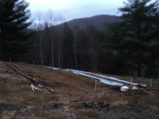 Signs of Spring have finally arrived to the N GA mountains. Saturday was a beautiful day to be out working. The sun was shining bright with temps in the mid 60’s. I was forced to change the locations of the rows after discovering areas of hard pan. Hard pan is soil compacted to a very rock-like hardness that water will not penetrate and roots cannot breach. My hope is that since the vines are 6 ft apart, careful planning will allow the vines to straddle the narrow ribbons of hard pan. Grape roots go very deep, but not so wide. Any hard pan I encounter when planting will be aggressively attacked to create areas for roots.