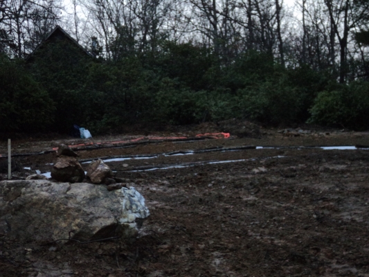 Signs of Spring have finally arrived to the N GA mountains. Saturday was a beautiful day to be out working. The sun was shining bright with temps in the mid 60’s. I was forced to change the locations of the rows after discovering areas of hard pan. Hard pan is soil compacted to a very rock-like hardness that water will not penetrate and roots cannot breach. My hope is that since the vines are 6 ft apart, careful planning will allow the vines to straddle the narrow ribbons of hard pan. Grape roots go very deep, but not so wide. Any hard pan I encounter when planting will be aggressively attacked to create areas for roots.