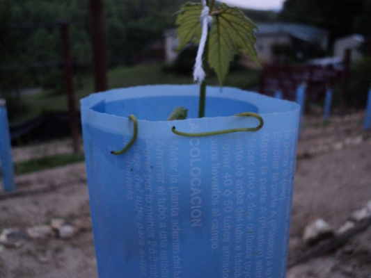 The vines are looking pretty good. There is a little black something on many of the leaves and I will need to monitor that very closely. The Nortons continue to be the growth champs with 3 vines popping above the grow tubes! Norton # 5 has a shoot 4-5 inches above the tube and has tendrils gripping and hanging on the top of the grow tube. See pic below.