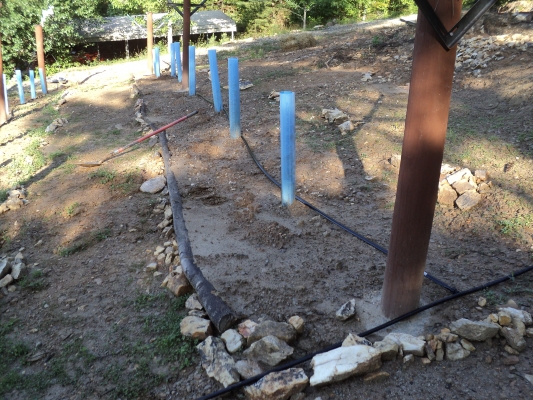 Future projects include plantings for erosion control, fence posts along the driveway, a solar-lit giant wind chime and at least two more rows of vines. The 80 foot tall white pine will need to come down for more rows.