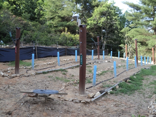 Future projects include plantings for erosion control, fence posts along the driveway, a solar-lit giant wind chime and at least two more rows of vines. The 80 foot tall white pine will need to come down for more rows.
