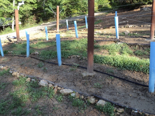 I did a little work in the vineyard. I finished the Chambourcin  trellis by adding two wires. I attempted two repairs on the drip tape, but the barbed connectors I used only slowed the leaks a little bit. I will probably end up replacing the whole strip since both leaks are in the same run.