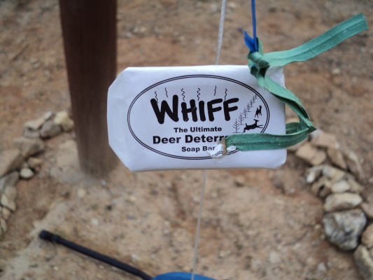 The deer are snooping around the vines, but there is not much available for them to munch on – yet! I installed some deer repellent “soaps” called “Whiff” that are supposed to irritate them. Time will tell if it works.