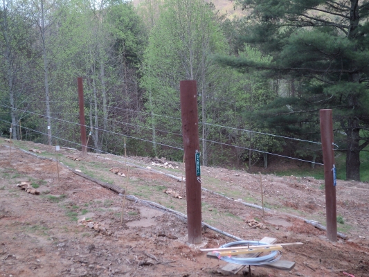 On Saturday I ran trellis wire on the Mid Wire Cordon and Top Wire Cordon trellises. My Geneva Double Curtain trellis for the Norton will have to be re-engineered since the cross arms bent when the 300 pounds of pressure required was too much for them to handle.