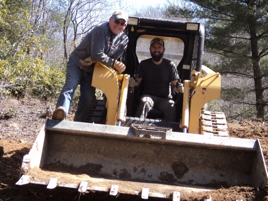 I made the executive decision to give it a shot. It was an absolutely beautiful weekend with clear blue skies and temps in the low 60’s. Our son Matt came to help and was a big asset. The skid steer loader was a blast to operate and much progress was made. The ‘thinking rock’ got moved out of the way to a much more prominent spot near the driveway gate. Lots of leveling was done and countless roots torn out. It’s not exactly a precision machine and a professional could undoubtedly have done better, but it’s not bad considering. The large Blackberry patch at the bottom of the hill was mostly obliterated and even more firewood was cut. Generally a success, but we could have used the machine another 8 hours for sure. Since the rental fee is pricey – that will have to wait and we’ll have to make due with what we got done.
