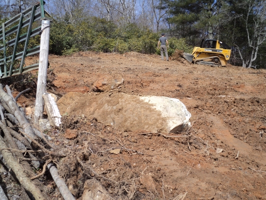 I made the executive decision to give it a shot. It was an absolutely beautiful weekend with clear blue skies and temps in the low 60’s. Our son Matt came to help and was a big asset. The skid steer loader was a blast to operate and much progress was made. The ‘thinking rock’ got moved out of the way to a much more prominent spot near the driveway gate. Lots of leveling was done and countless roots torn out. It’s not exactly a precision machine and a professional could undoubtedly have done better, but it’s not bad considering. The large Blackberry patch at the bottom of the hill was mostly obliterated and even more firewood was cut. Generally a success, but we could have used the machine another 8 hours for sure. Since the rental fee is pricey – that will have to wait and we’ll have to make due with what we got done.