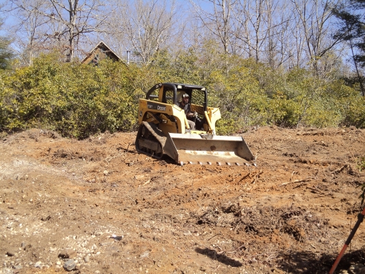 I made the executive decision to give it a shot. It was an absolutely beautiful weekend with clear blue skies and temps in the low 60’s. Our son Matt came to help and was a big asset. The skid steer loader was a blast to operate and much progress was made. The ‘thinking rock’ got moved out of the way to a much more prominent spot near the driveway gate. Lots of leveling was done and countless roots torn out. It’s not exactly a precision machine and a professional could undoubtedly have done better, but it’s not bad considering. The large Blackberry patch at the bottom of the hill was mostly obliterated and even more firewood was cut. Generally a success, but we could have used the machine another 8 hours for sure. Since the rental fee is pricey – that will have to wait and we’ll have to make due with what we got done.