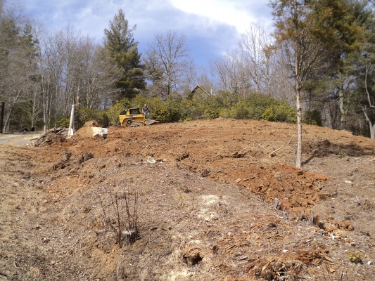 I made the executive decision to give it a shot. It was an absolutely beautiful weekend with clear blue skies and temps in the low 60’s. Our son Matt came to help and was a big asset. The skid steer loader was a blast to operate and much progress was made. The ‘thinking rock’ got moved out of the way to a much more prominent spot near the driveway gate. Lots of leveling was done and countless roots torn out. It’s not exactly a precision machine and a professional could undoubtedly have done better, but it’s not bad considering. The large Blackberry patch at the bottom of the hill was mostly obliterated and even more firewood was cut. Generally a success, but we could have used the machine another 8 hours for sure. Since the rental fee is pricey – that will have to wait and we’ll have to make due with what we got done.