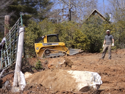 I made the executive decision to give it a shot. It was an absolutely beautiful weekend with clear blue skies and temps in the low 60’s. Our son Matt came to help and was a big asset. The skid steer loader was a blast to operate and much progress was made. The ‘thinking rock’ got moved out of the way to a much more prominent spot near the driveway gate. Lots of leveling was done and countless roots torn out. It’s not exactly a precision machine and a professional could undoubtedly have done better, but it’s not bad considering. The large Blackberry patch at the bottom of the hill was mostly obliterated and even more firewood was cut. Generally a success, but we could have used the machine another 8 hours for sure. Since the rental fee is pricey – that will have to wait and we’ll have to make due with what we got done.