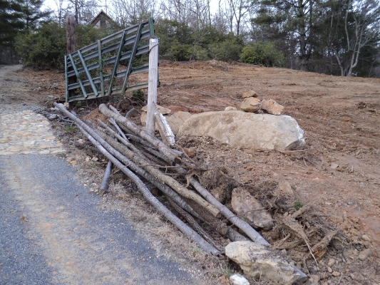 I made the executive decision to give it a shot. It was an absolutely beautiful weekend with clear blue skies and temps in the low 60’s. Our son Matt came to help and was a big asset. The skid steer loader was a blast to operate and much progress was made. The ‘thinking rock’ got moved out of the way to a much more prominent spot near the driveway gate. Lots of leveling was done and countless roots torn out. It’s not exactly a precision machine and a professional could undoubtedly have done better, but it’s not bad considering. The large Blackberry patch at the bottom of the hill was mostly obliterated and even more firewood was cut. Generally a success, but we could have used the machine another 8 hours for sure. Since the rental fee is pricey – that will have to wait and we’ll have to make due with what we got done.