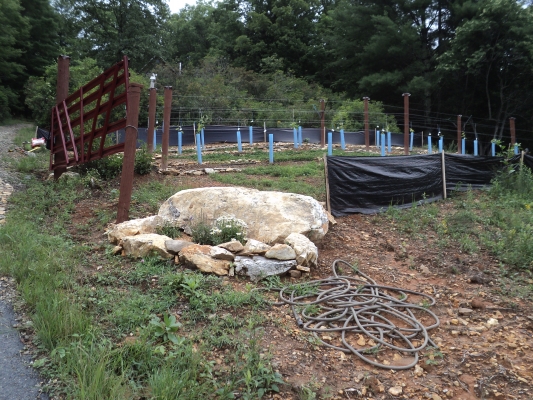 I was able to (finally) plant the rose on the end of the Norton row and the Lavender plants on the end of the Chambourcin row. See pics below. I decided against the 2nd rose on the Chardonnel row since room was an issue.