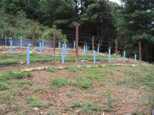 I was able to (finally) plant the rose on the end of the Norton row and the Lavender plants on the end of the Chambourcin row. See pics below. I decided against the 2nd rose on the Chardonnel row since room was an issue.