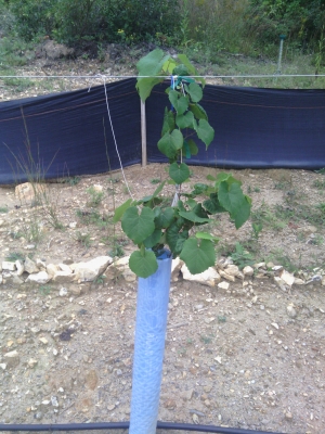 2 trunks split 14" below top of grow tube. total 8" above 1st wire. just a couple brown leaves. Rest very healthy looking.